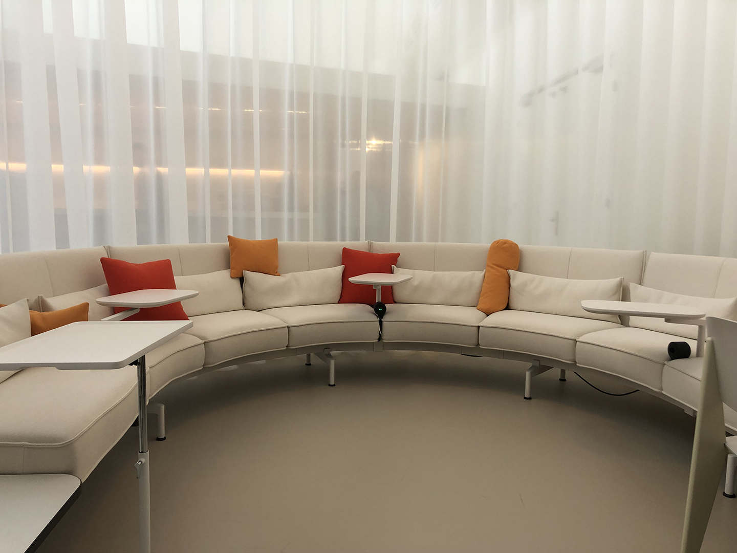 Zu den Lösungen im Büro-Alltag gibt es viel zu berichten. Man spürt es regelrecht an der gesamten Atmosphäre, mit welcher Konsequenz hier Firmenphilosophie und Gestaltungs-Anspruch erprobt und gelebt werden. Die Architektur ist das eine, das andere sind die vielfältig gestalteten Büroräume mit Arbeitsplätzen für die unterschiedlichen Raum-Bedürfnisse der MitarbeiterInnen und der Nutzungen. Neue Begriffe für Arbeitsplätze wurden kreiiert: Soft Work, Alcove Highback Work, Dancing Wall, Workbays … Farbigkeit und Gemütlichkeit oder mehr Menschlichkeit – wie Jan Teunen sagen würde – kommen in die Räume. Arbeitsplätze brauchen mehr Attraktivität als Anreiz für gute Mitarbeiter, denn die sind inzwischen rar.