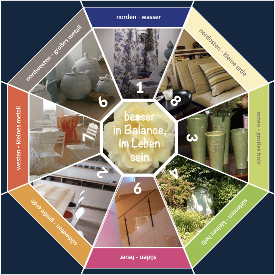 Farben, Formen, Materialien nach den Fünf Elementen ermittelt und auf den Grundriss eines Hauses übertragen, veranschaulichen atmosphärische Qualitäten von Räumen. So können wir zum Beispiel leichte, vitale, erdverbundene oder kühl-nüchterne Stimmungen vorfinden. Gleichzeitig versinnbildlichen sie auch positive Potenziale der Räume, wie Gesundheit, Erfolg und Intelligenz, die wir fördern oder negative Aspekte, die wir vermeiden wollen.