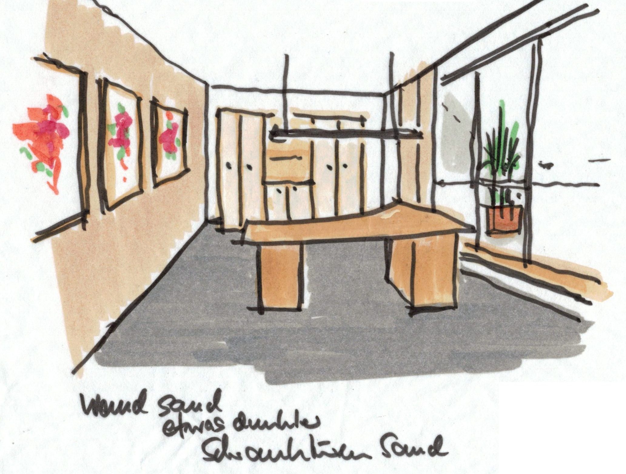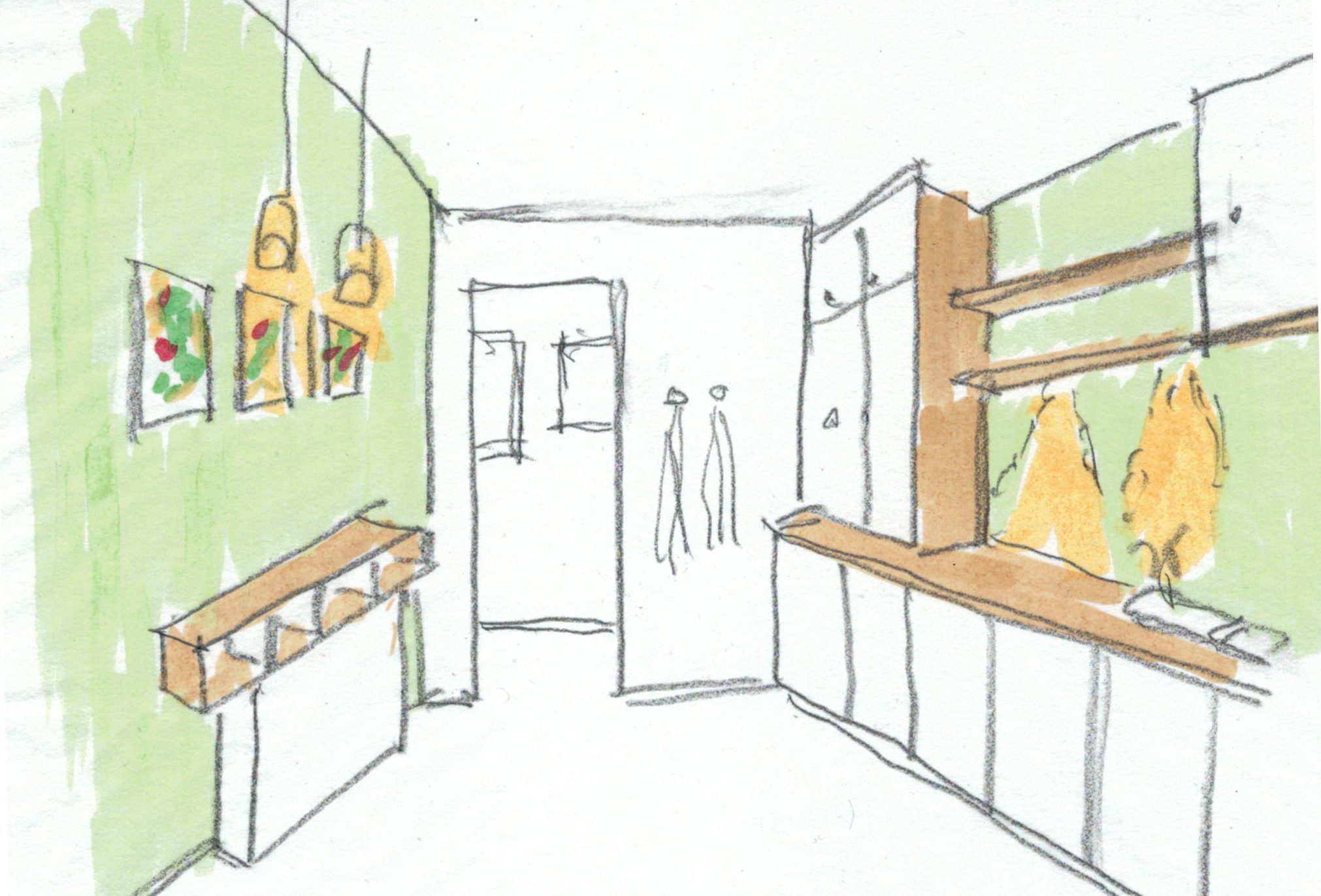 So entwarf ich Möbel und Bänke aus Naturholz, die ein Schreiner vor Ort baute, platzierte hochwertige Keramikgefäße und ließ hinterleuchtete Fotos anbringen. Die unterschiedlichen Nutzungsbereiche wurden durch frische Farben an den Wänden mit eindeutiger Beschriftung zoniert.