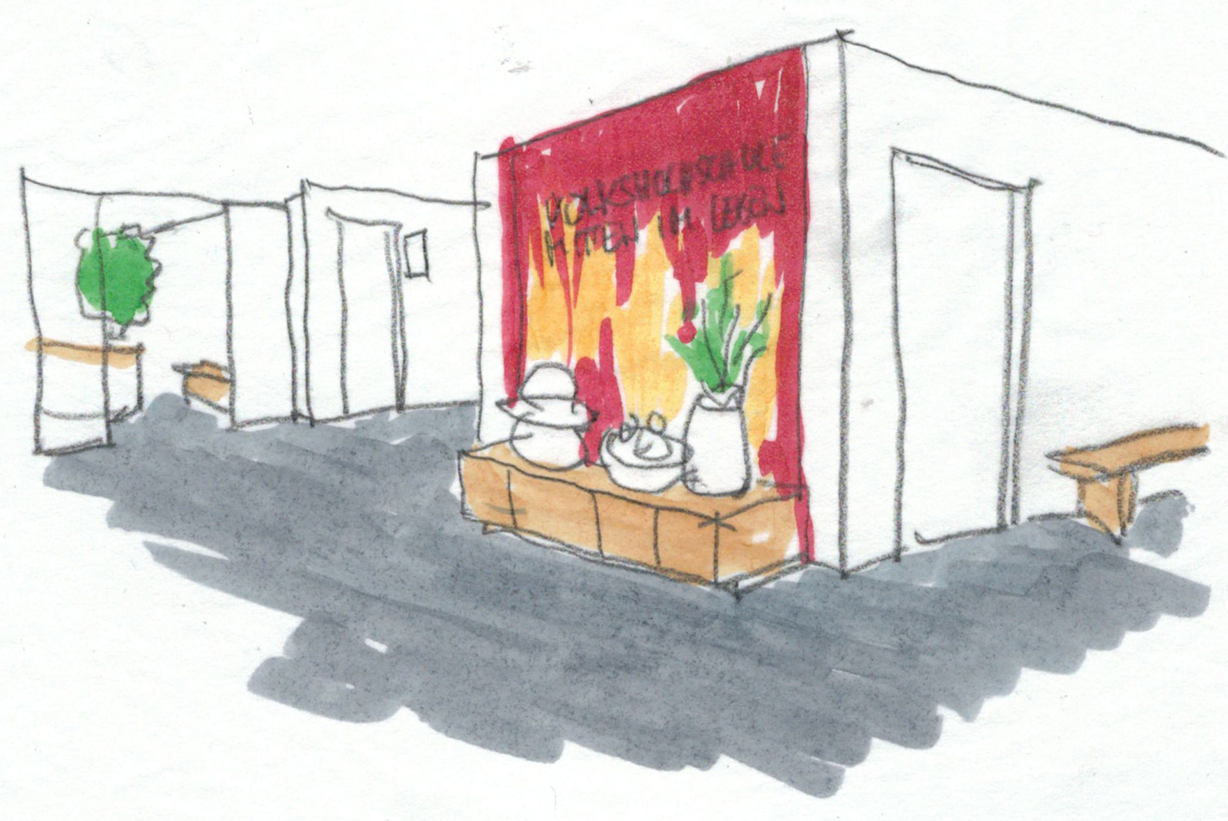 Die Räume der Volkshochschule entsprachen dem gemeinhin Üblichen bis sie von einer Reihe von Flüchtlingen zum Deutschlernen besucht wurde. Ihnen und auch allen anderen Kursteilnehmern und Mitarbeitern sollte durch die Neugestaltung des Empfangsbereichs und der Pausenzonen ein Stück Heimat gegeben werden. Dies für Menschen aus den verschiedensten Kulturen zu finden, führte zu einem Gestaltungskonzept, das einerseits eine klare Ausdruckskraft besitzt und den verschiedenen Nutzungen einen qualitätsvollen, ordnenden Rahmen gibt, aber auch Regionales und Natürliches ins Innere des Hauses bringt.